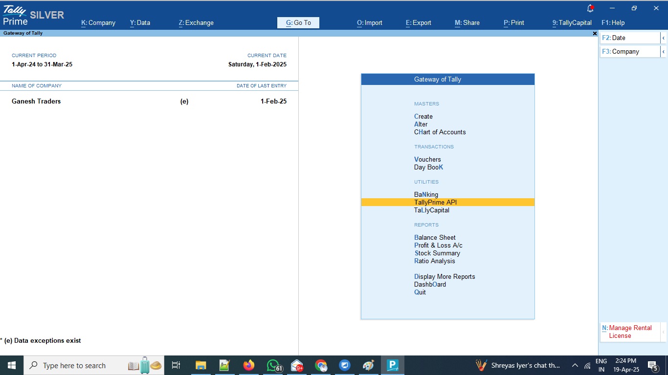 Once you have activated the TallyPrime GET API plugin, you will find new menu option on Gateway of Tally as TallyPrime API